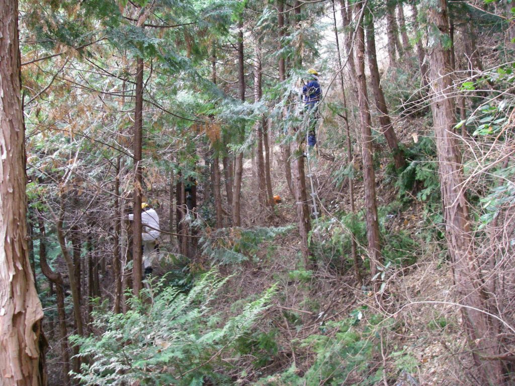 14時30分で終了の合図。急斜面を登りながら、見渡すと、だいぶ見通しがよくなって、人の動きがよく見えるようになってきた。ハシゴを抱えあげて、急斜面を登り、林道に出て土場へ戻る。斜面で足を踏ん張っているせいか、ふくらはぎが張っている。午後からは少し風も出たが、比較的暖かく、作業時には汗ばむほどであった。