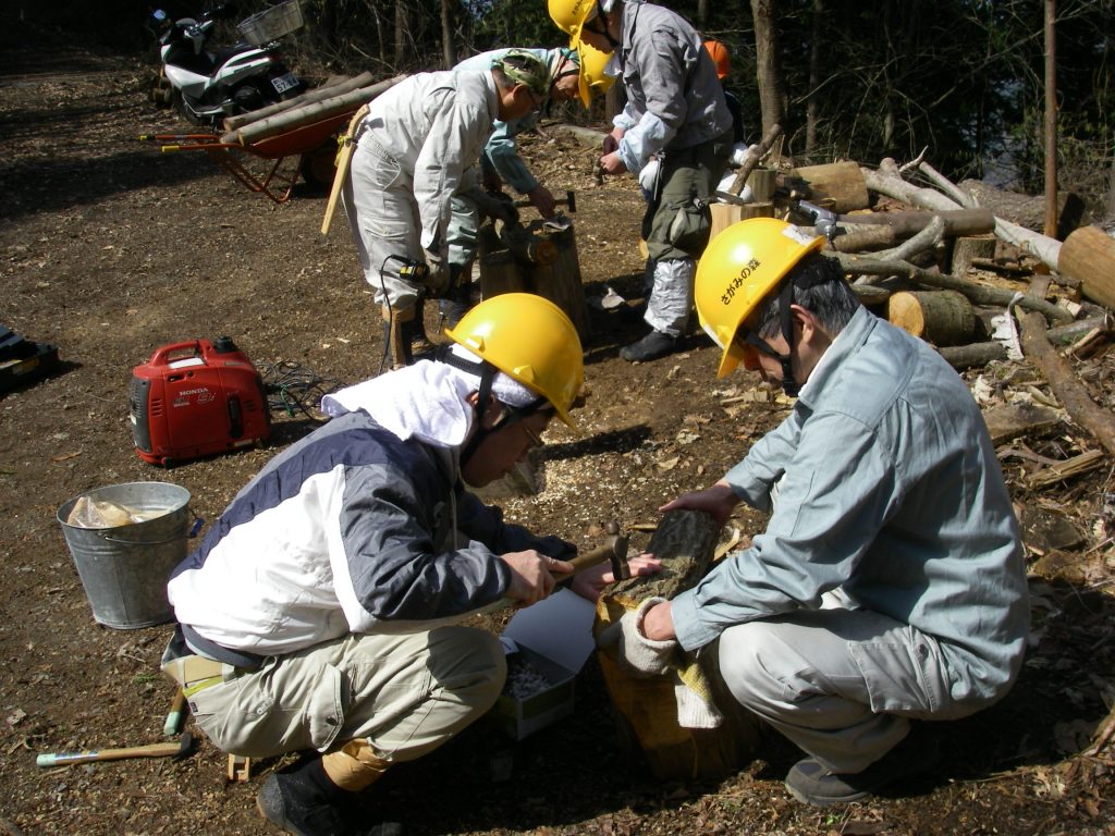 キノコは、ほだ木に穴をあけ、種ゴマを打ち込む。発電機を起動して、ドリルで穴あけ。ドリルは2台、4人ほどでどんどん進む。打ち込んだほだ木は、斜面に運び、積み置く。