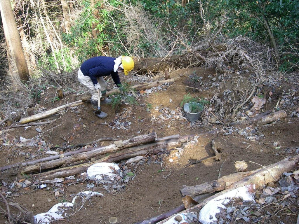 外のテーブルの周りにスギが発芽して生育している。小さいものを掘り取り、土場の奥の崩壊部に植栽する。ここは崩壊部の雨裂を土のうで埋め、丸太を渡して土留めにした場所。土は湿っていてちょうどよい。10本ほどなのですぐ終了。
