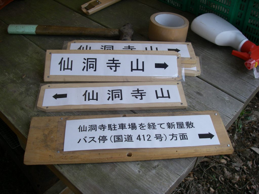 小屋の前の古くなった案内板をはがし、新しい図とボランティア募集の用紙を張り付ける。それと、山頂方面の誘導標を作る準備。板にパウチングした名称を釘で打ち付ける。支柱の丸太は広葉樹の除伐材を利用する。急な勾配の坂を登って、丸太を運び出してくる。ナタで柵を削るが、堅くてなかなか大変。