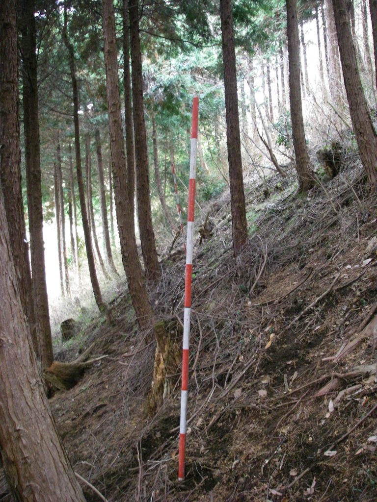 午後の作業は、枝打ちの続きと除伐した材などの片付けを行う。また、ヒノキ林の状況を把握するために、20m×20のプロットを測り、内部のヒノキの幹周を測る。林内は暗く、林床植生は少ないが、急傾斜なので、なかなか大変。これをまとめて作業指針とする予定。