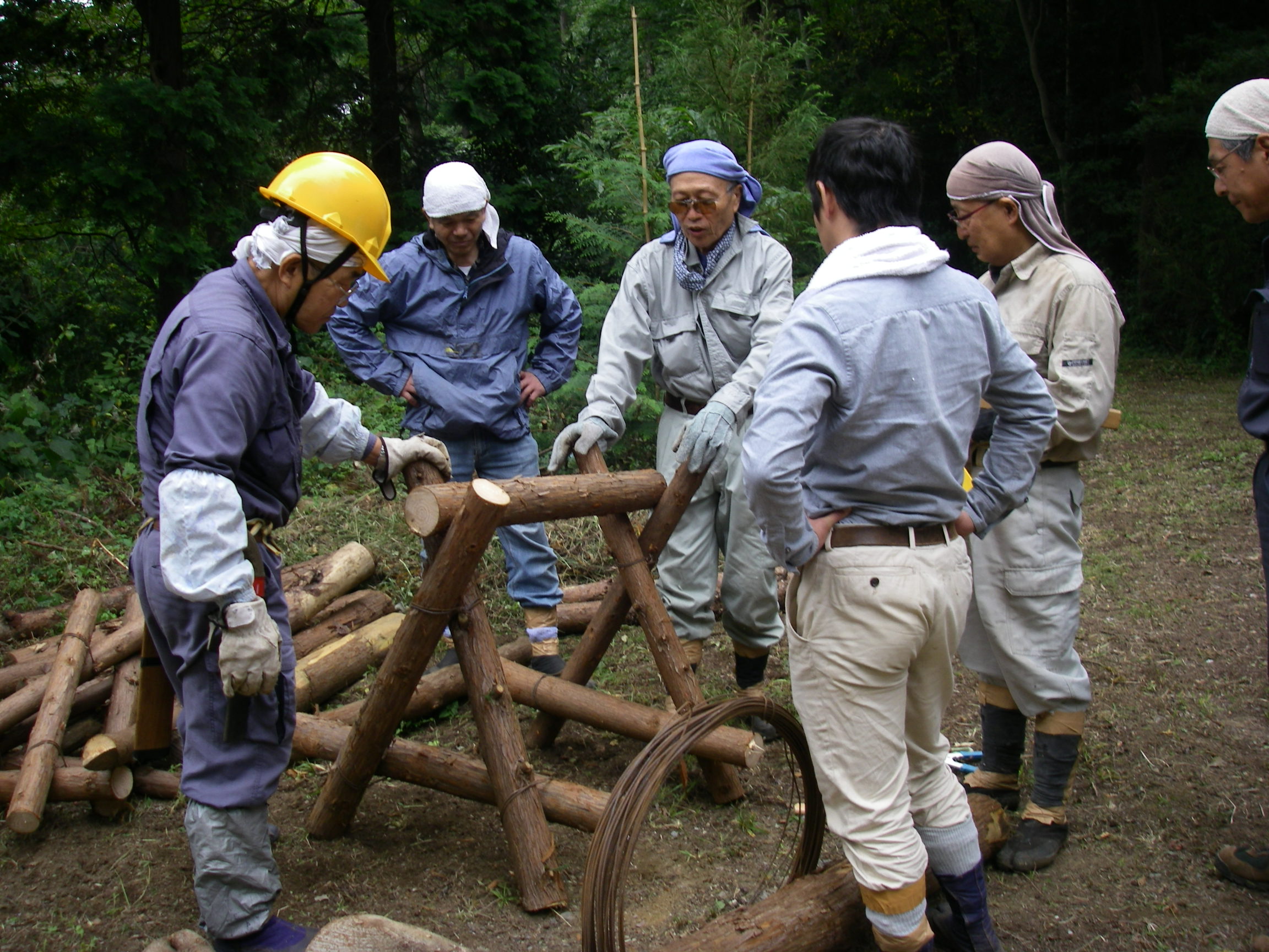 土場ではイベントのために準備。丸太切りのための台がつくられていた。作るにあたっていろいろと試行錯誤があるようだ。