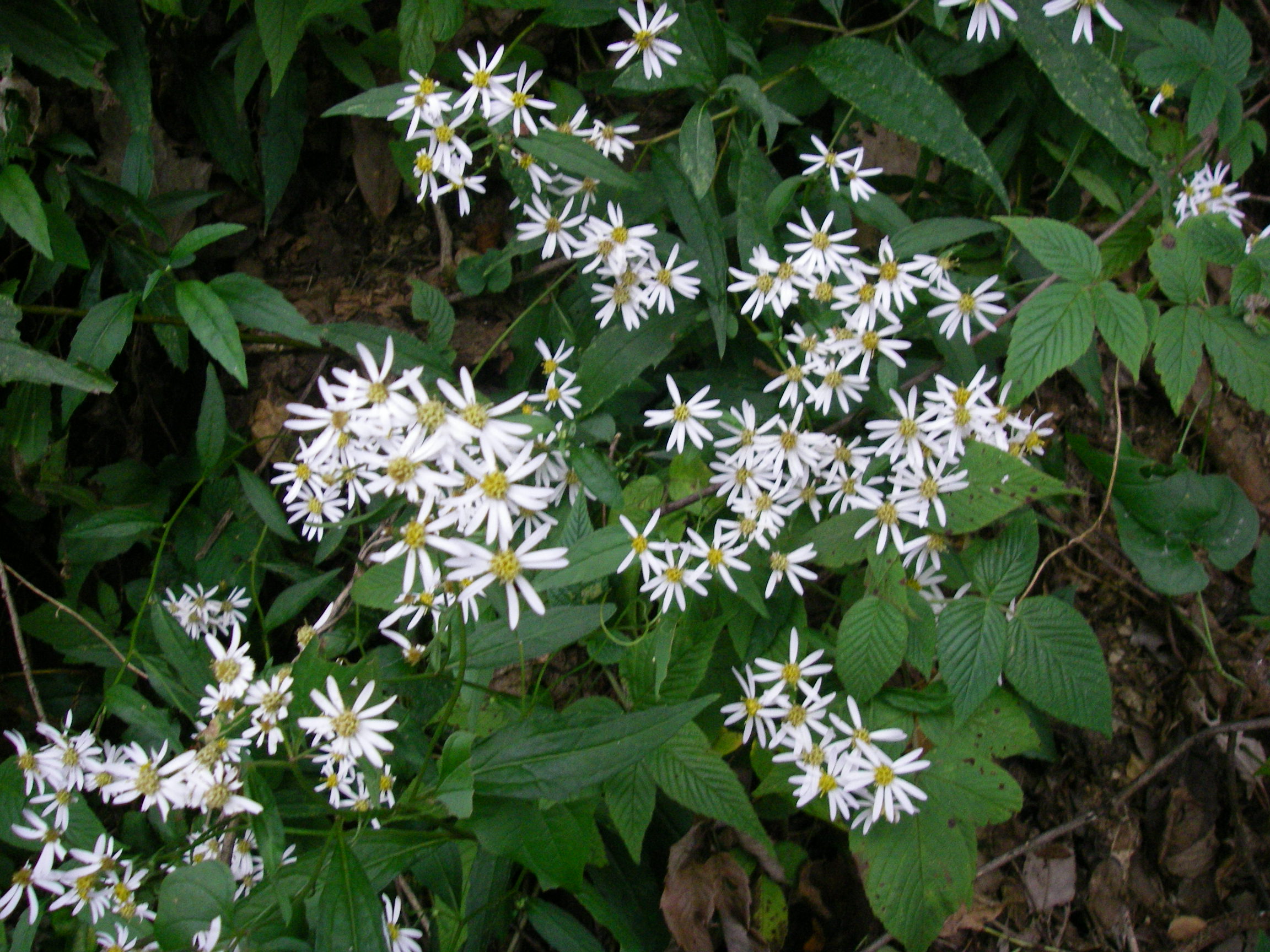 11時30分を過ぎて、昼食のために土場へ下る。途中にはオニグルミが落ちていた。林道沿いにはシロヨメナが花盛り。ヤクシソウも咲き始めた。